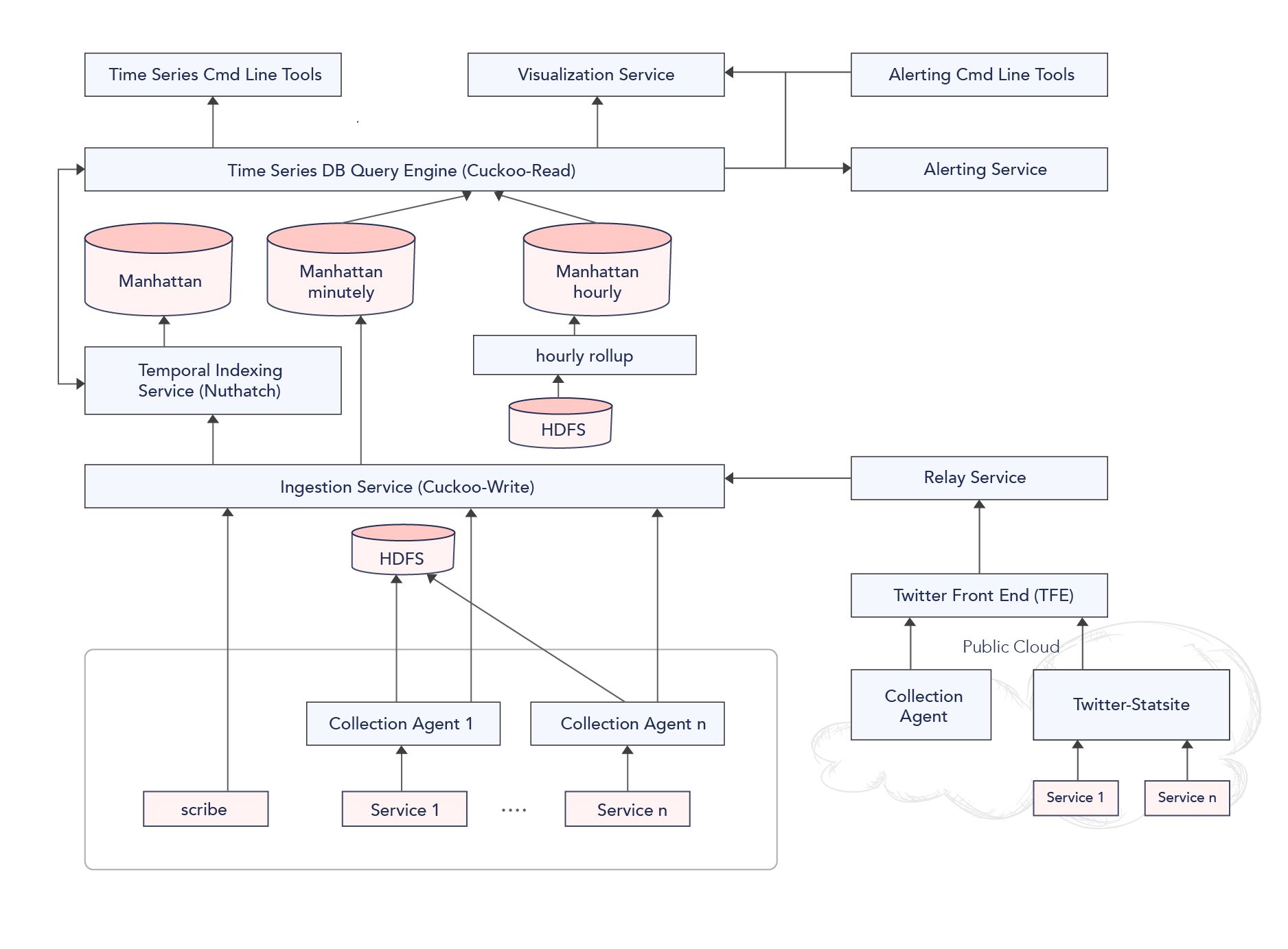 극단적인 경우이긴 한데, 트위터와 같이 분당 메트릭이 4 Billion이 넘어가는 상황에서는 기존의 단순한 아키텍처를 사용할 수 없었다. 솔직히 아키텍처 생긴것만 봐서는 이미 아주 무난한 high-throughput 모니터링 시스템 같아 보이는데...