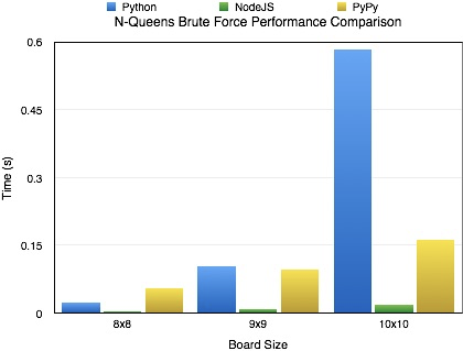 실제 N-Queen 문제 푸는 테스트 결과에서, 파이썬이 상당히 느린 성능을 보여주고 있습니다.