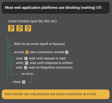 이 일련의 과정들은 모두 하나의 프로세스 안에서 일어나기 때문에, Context switching 오버헤드가 훨씬 적습니다. 이에 따라 훨씬 더 많은 커넥션을 더 유연하게 수용할 수 있게 되는 것입니다.