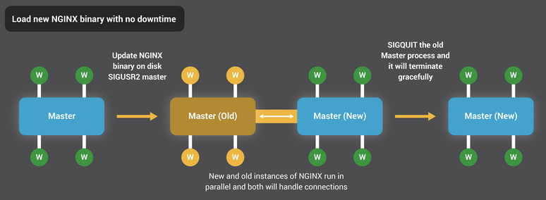 바이너리 교체의 경우, SIGUSR2 신호를 받으면 새로운 마스터 프로세스를 띄우고, 기존 프로세스와 새 프로세스는 소켓으로 자료를 전달한다고 합니다. 이를 통해서 Listening 소켓을 공유할 수 있게 되고, 새로운 마스터 프로세스의 부팅이 끝나면 기존 프로세스는 Gracefully exit를 하게 됩니다.