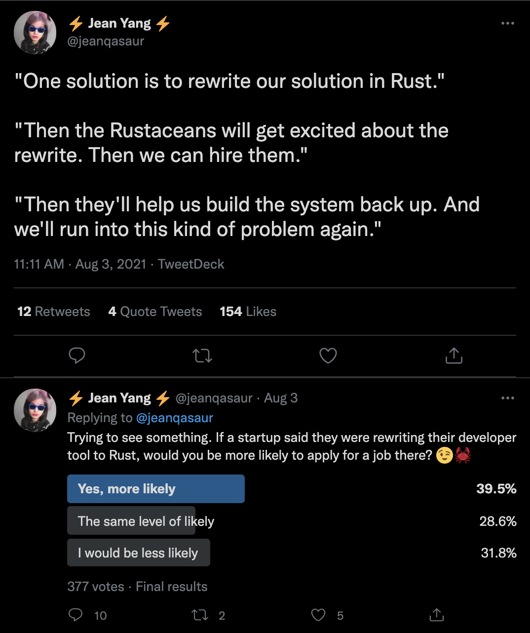 농담이 아니라 진짜로 “Rust rewrite 현상”이 꽤 만연해 있습니다. 각종 스타트업 포스팅이나 블로그 포스팅들에서도 Rust rewrite 글을 어렵지 않게 찾아볼 수 있죠.
